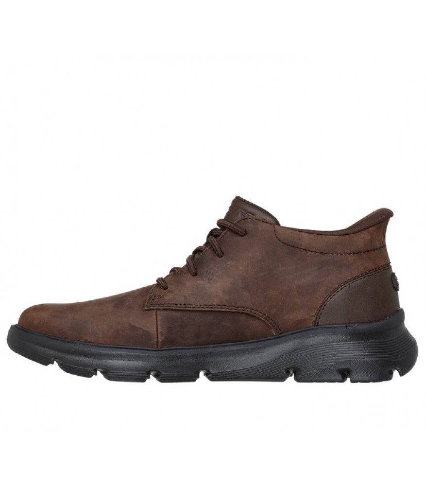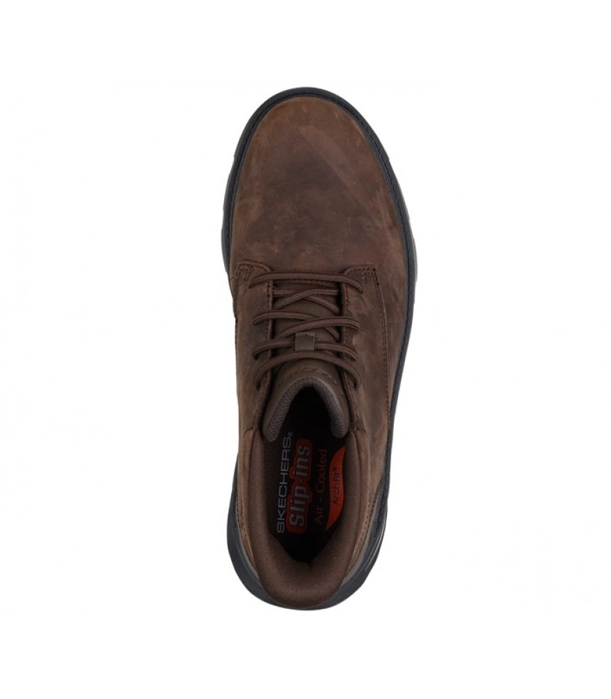 Pasa del look de oficina al de salir a cenar fácilmente con las Skechers Hands Free Slip-ins® Relaxed Fit™: Arch Fit Garza - Ridley. Diseñada con nuestro Heel Pillow™, esta amplia bota chukka sin cordones ha recibido el sello de aceptación de la APMA y cuenta con una parte superior de piel con punta redondeada, capas superpuestas sintéticas, cordones elásticos fijos y una cómoda plantilla Air-Cooled Arch Fit®.
