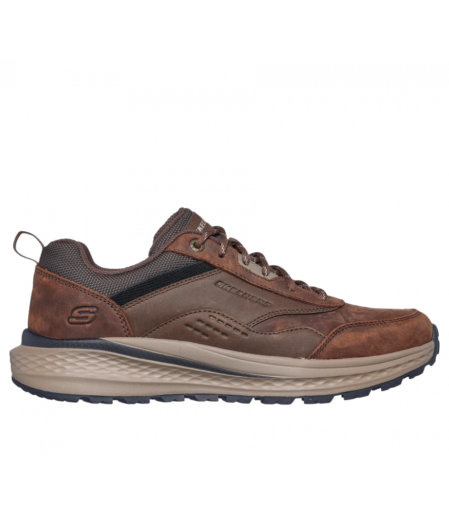 Zapatilla casual para hombre Relaxed Fit: Slade - Peralto. Parte superior de piel y material sintético en color marrón. Plantilla Skechers Air-Cooled Memory Foam® para máxima comodidad y transpirabilidad. Amortiguación Goga Mat Arch™ que mejora el soporte del arco. Horma ancha (relaxed fit) y cierre con cordones. Ideal para uso diario.